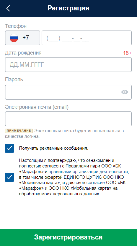 Марафон, как и любая другая легальная компания, осуществляет платежи игроков через посредника – Единый ЦУПИС. Если у пользователя есть профиль в ЦУПИС, следует ввести привязанный к нему номер мобильника, дабы ускорить верификацию.