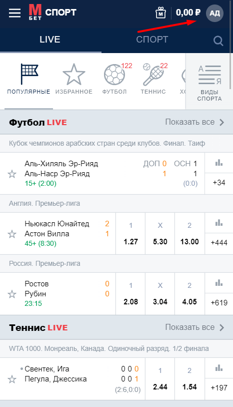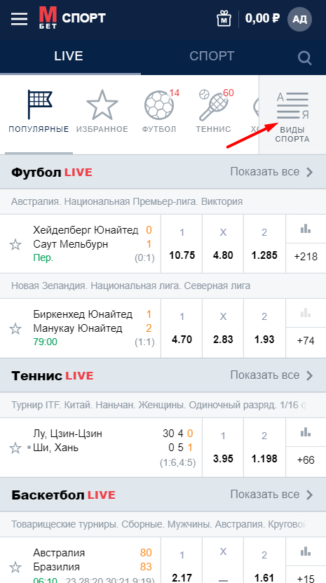 На главной странице мобильного портала размещены популярные лайв-события и анонсы ближайших поединков. Вверху есть слайдер для быстрого переключения между спортивными дисциплинами. Также можно нажать на «Виды спорта», посмотреть весь список в алфавитном порядке и открыть нужную линию.