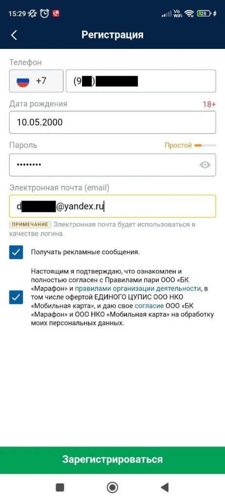 Запускаем программу и переходим к регистрации. В анкете указываем номер телефона, дату рождения и e-mail. Там же придумываем пароль. Поля для ввода промокодов нет, т. к. в компании «Марафон» их можно активировать во время пополнения счета.